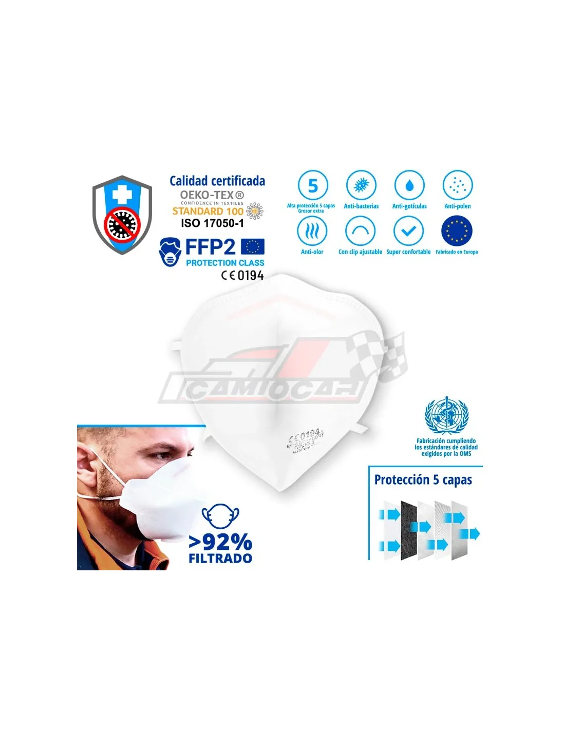 Esta mascarilla cuenta con cinco capas de filtrado que aseguran una eficacia de filtración del ≥94%, cumpliendo con los estándares establecidos en la normativa EN 149:2001+A1:2009. Esto la hace adecuada para su uso en entornos industriales, sanitarios y urbanos, proporcionando una barrera efectiva contra contaminantes y agentes patógenos.